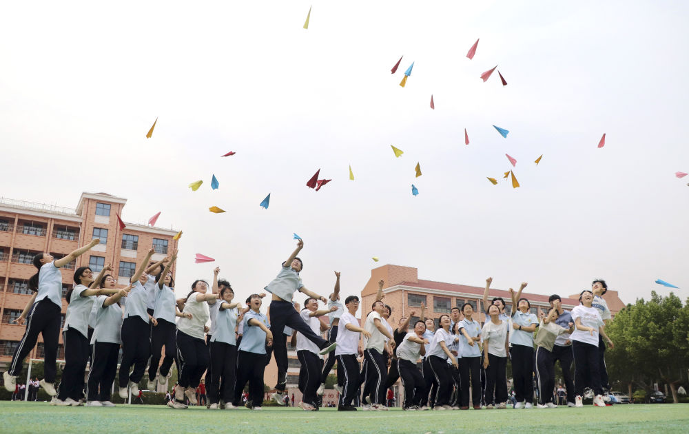 5月22日,在山東省高密市第五中學(xué),高三學(xué)生將寫有夢想的紙飛機(jī)拋向空中。