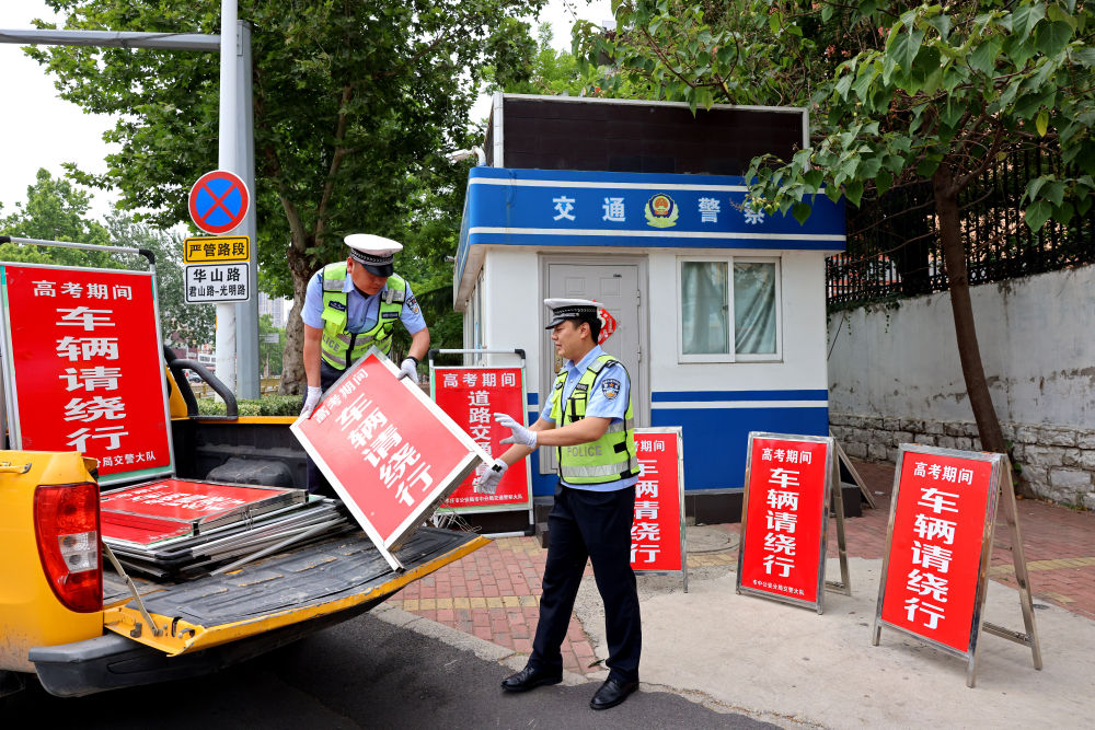 6月6日,山東省棗莊市公安局市中分局交警大隊(duì)輔警把高考期間道路交通管制標(biāo)志牌運(yùn)送到各考點(diǎn)執(zhí)勤崗。新華社發(fā)(孫中喆 攝)