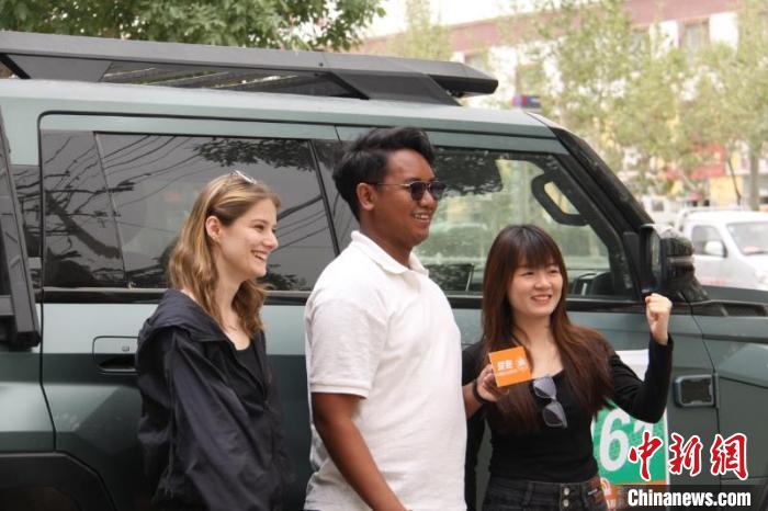 北京語(yǔ)言大學(xué)的留學(xué)生們?cè)诃h(huán)塔拉力賽事期間體驗(yàn)中國(guó)新能源車(chē)。賈志鵬 攝