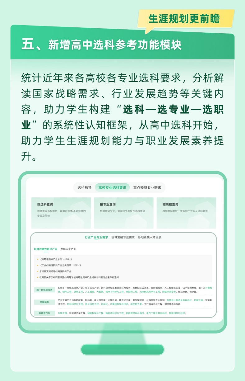 統(tǒng)計(jì)近年來(lái)各高校各專業(yè)選科要求,分析解讀國(guó)家戰(zhàn)略需求、行業(yè)發(fā)展趨勢(shì)等關(guān)鍵內(nèi)容,助力學(xué)生構(gòu)建“選科—選專業(yè)—選職業(yè)”的系統(tǒng)性認(rèn)知框架,從高中選科開(kāi)始,助力學(xué)生生涯規(guī)劃能力與職業(yè)發(fā)展素養(yǎng)提升。