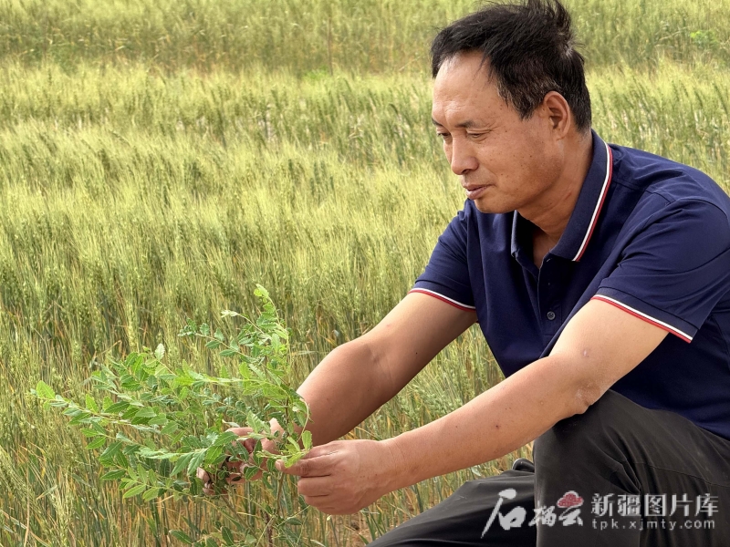 6月13日,且末縣老兵治沙隊創(chuàng)始人田來群在查看文冠果苗生長情況。