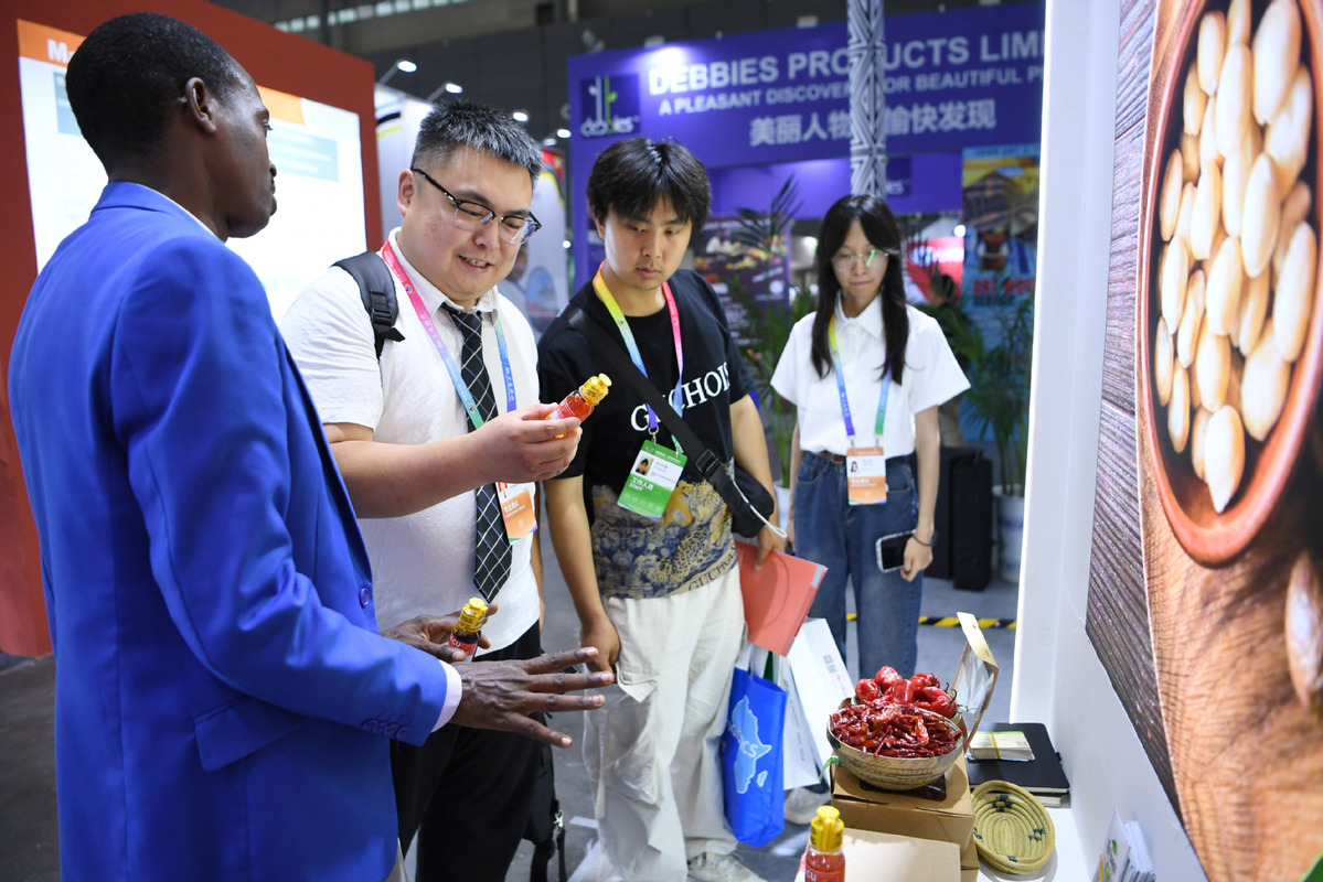 6月12日,在長沙國際會展中心,參展商推介盧旺達辣椒產(chǎn)品。當日,第四屆中國-非洲經(jīng)貿(mào)博覽會在長沙舉行。(圖片來源:新華社)