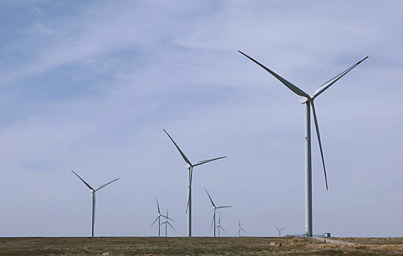 哈薩克斯坦札納塔斯拍攝的札納塔斯100兆瓦風(fēng)電項目風(fēng)機。圖片來源:新華社