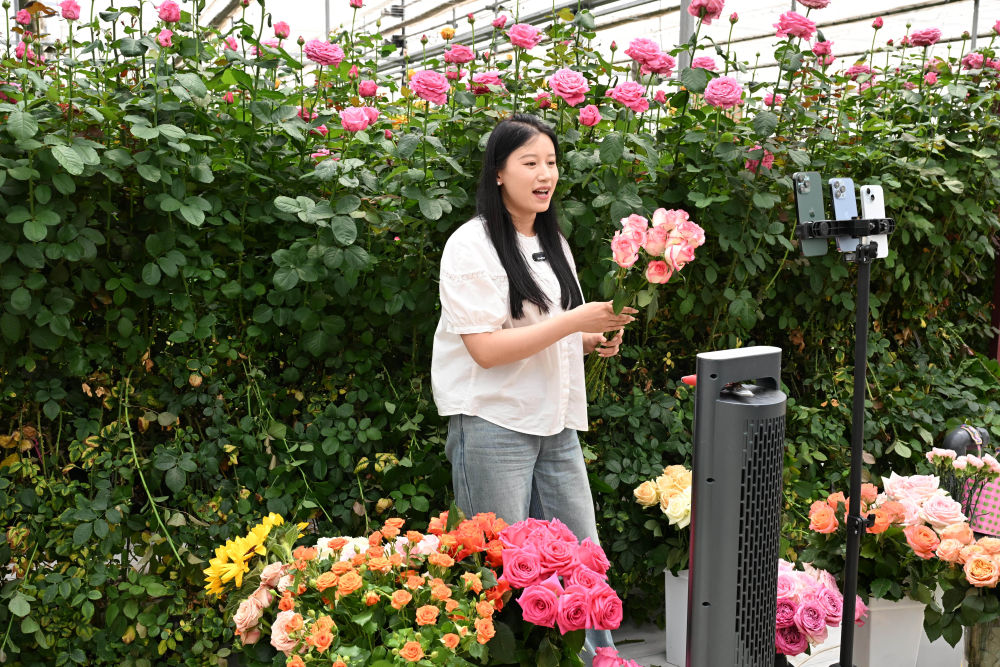 5月24日,在莒縣招賢鎮(zhèn)曲坊現(xiàn)代農(nóng)業(yè)產(chǎn)業(yè)園的玫瑰基地,工作人員通過網(wǎng)絡直播銷售鮮切玫瑰花。新華社記者 馬寧 攝