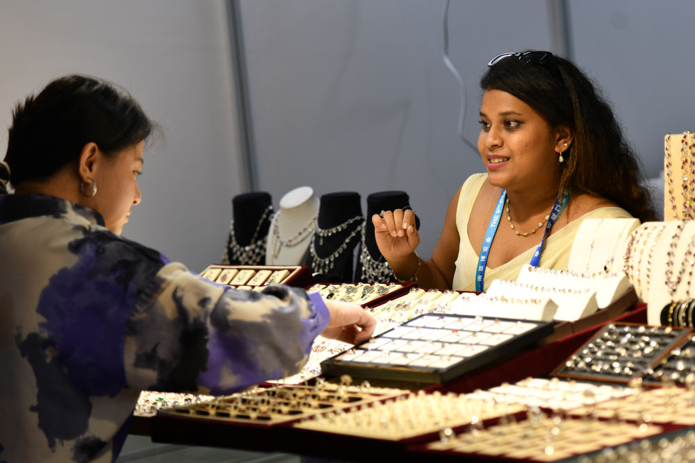 6月19日,斯里蘭卡展區(qū)的展商向顧客推介特色飾品。新華社發(fā)(彭奕凱 攝)