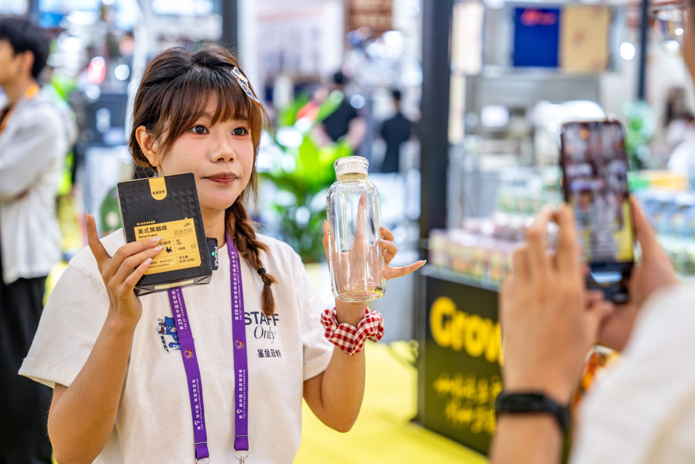 6月19日,一名參展商在第9屆中國(guó)—南亞博覽會(huì)咖啡產(chǎn)業(yè)館直播推介云南小??Х?。新華社記者胡超 攝