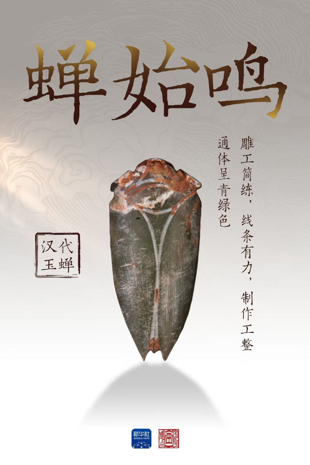 這件漢代玉蟬通體呈青綠色,盛夏的氣息撲面而來。《禮記·月令》記載:“仲夏之月,蟬始鳴”,古人發(fā)現(xiàn)夏至之日陽氣達(dá)到極盛,蟄伏地底多年的蟬若蟲會(huì)破土羽化宣告盛夏來臨,這是自然界的昆蟲“節(jié)氣預(yù)報(bào)”。
