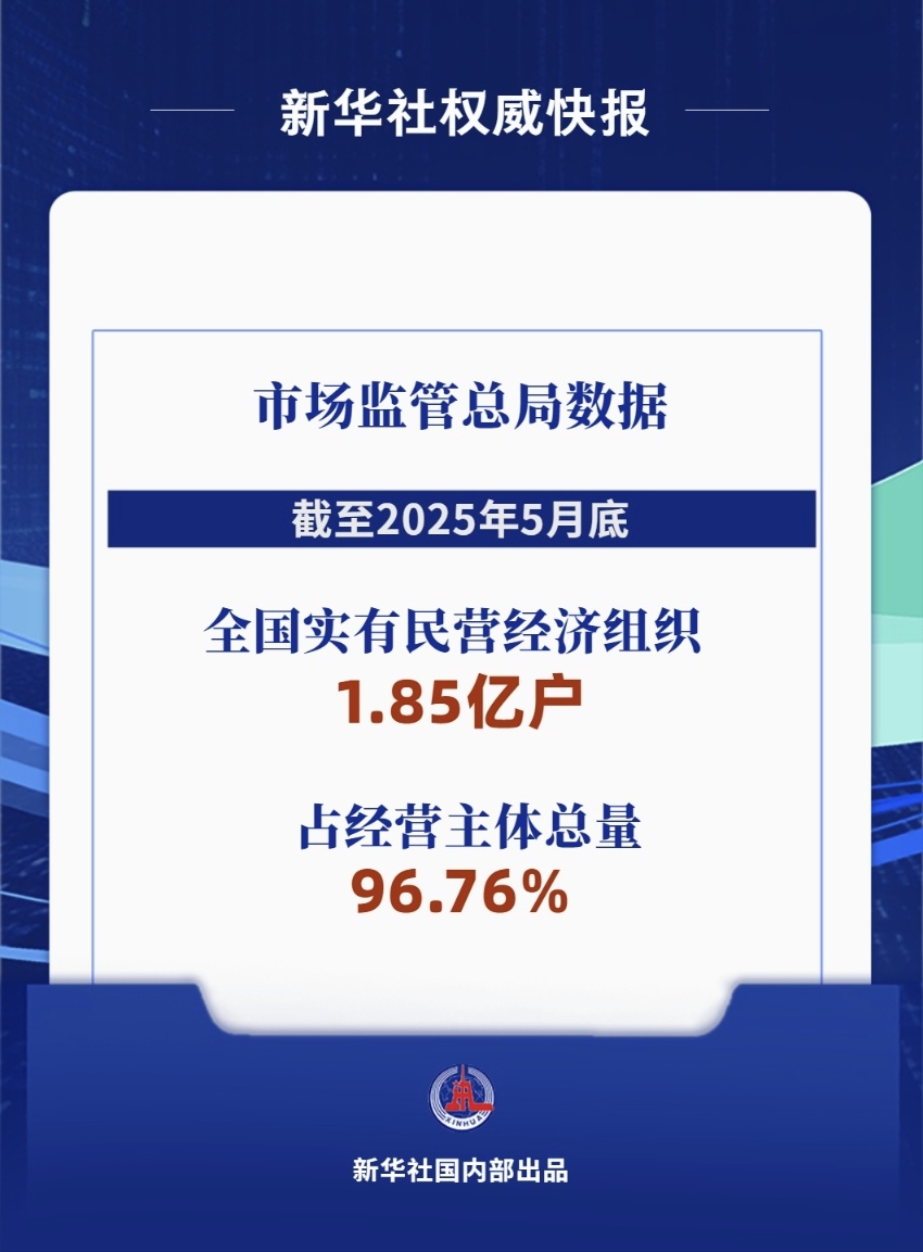 市場監(jiān)管總局?jǐn)?shù)據(jù)顯示,截至2025年5月底,全國實有民營經(jīng)濟(jì)組織1.85億戶,占經(jīng)營主體總量的96.76%,同比增長2.3%。其中,民營企業(yè)數(shù)量突破5800萬戶,同比增長5.2%;個體工商戶達(dá)1.27億戶,同比增長1%。