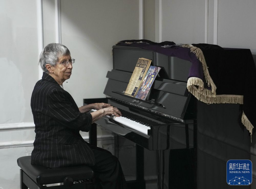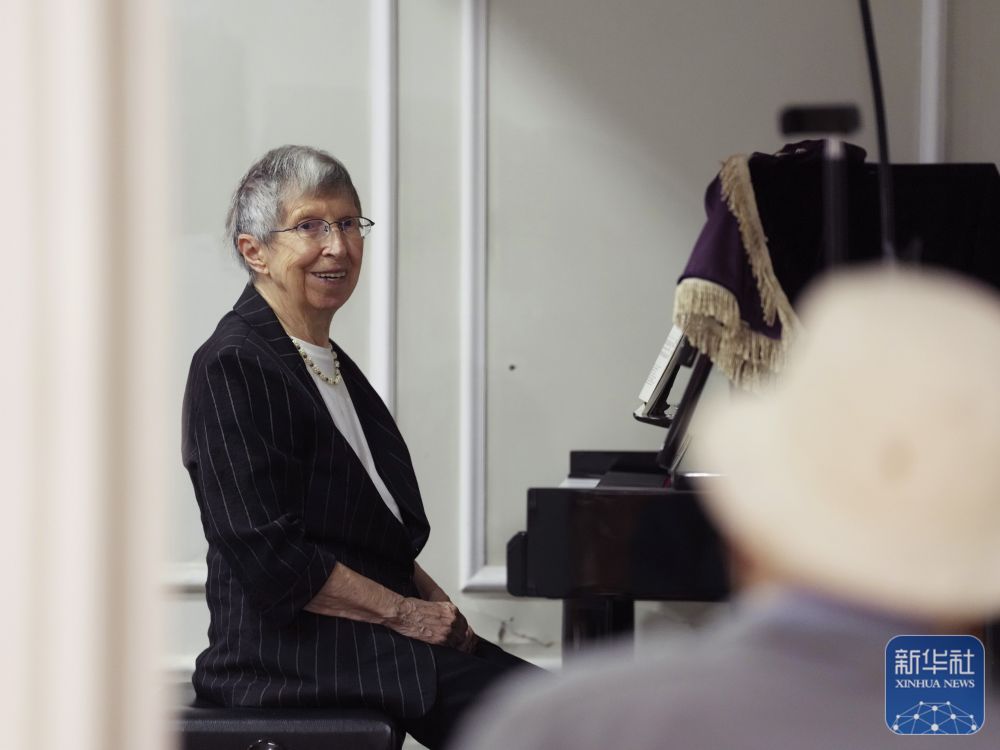 2025年6月13日,白麗詩(shī)在養(yǎng)老院的多功能廳彈鋼琴。