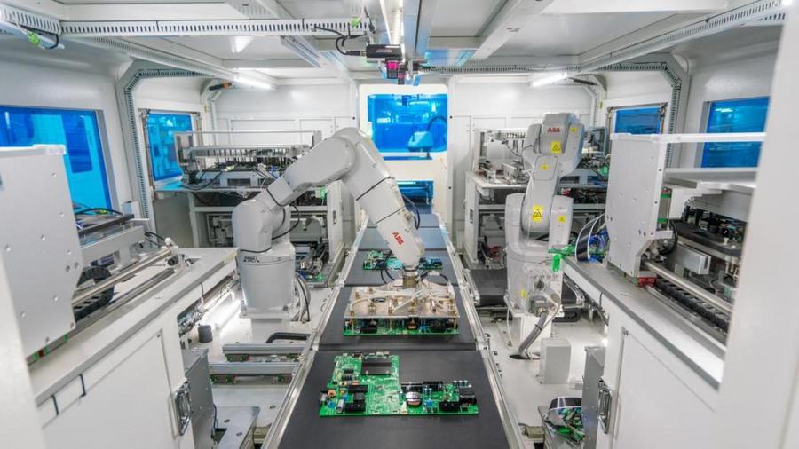 現(xiàn)代化的生產(chǎn)車間里,大部分工作已被機(jī)械臂和機(jī)器人“接管”;車間一側(cè)的智慧大屏上,實(shí)時顯示溫濕度、靜電、隱患巡查等關(guān)鍵數(shù)據(jù)。