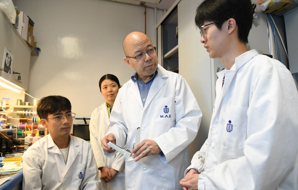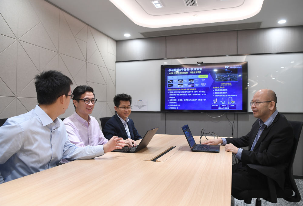 6月19日,香港太空機械人與能源中心聯(lián)合主任于宏宇教授(右二)在實驗室與團隊成員交流。新華社記者 陳鐸 攝