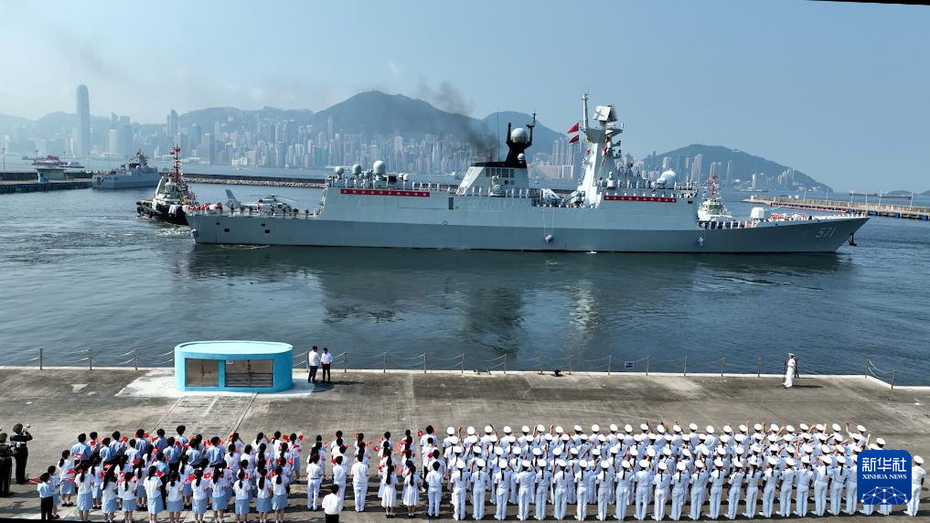 7月7日,湛江艦駛離昂船洲軍營(yíng)碼頭,士兵分區(qū)列隊(duì)向前來(lái)送行的人群揮手告別。新華社發(fā)(馮麗 攝)