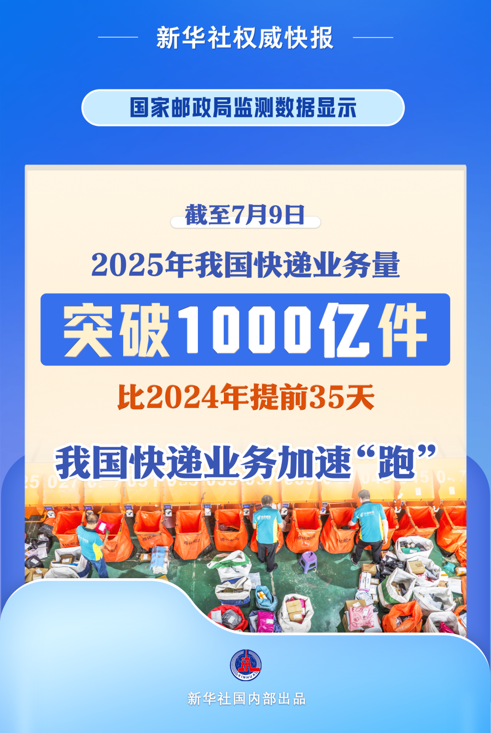 國家郵政局監(jiān)測數(shù)據(jù)顯示,截至7月9日,今年我國快遞業(yè)務(wù)量突破1000億件,比2024年提前35天。
