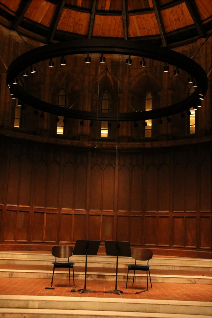 傍晚時分,夏風(fēng)習(xí)習(xí),天色黛青。我坐在棕色的椅子上,悠揚的大提琴聲從穹頂上緩緩落下,浸潤在斑駁的石柱縫隙里,又飄浮于塵埃之上,圓形天窗下有一道水滴形狀的光斑。在這樣的傍晚,每個人都能感受到安里甘的美。