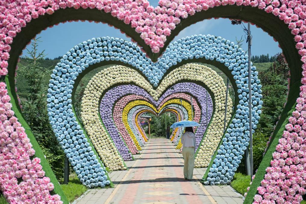 7月22日,在青海省大通縣邊麻溝花海景區(qū),一名游客經(jīng)過鮮花長廊。新華社記者 孫瑞博 攝