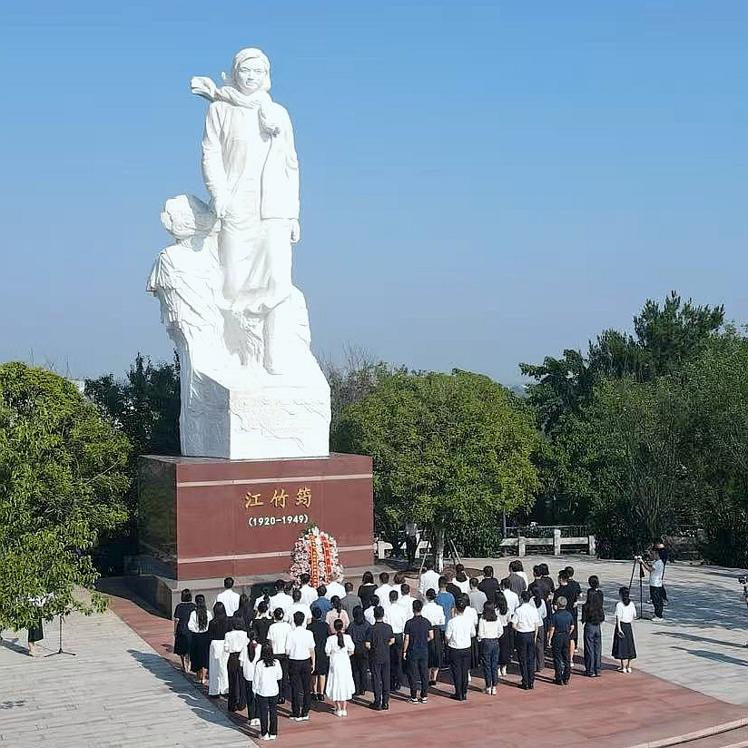 7月29日,參賽選手前往江姐故里紅色教育基地,向江姐塑像敬獻花籃。(主辦方供圖)