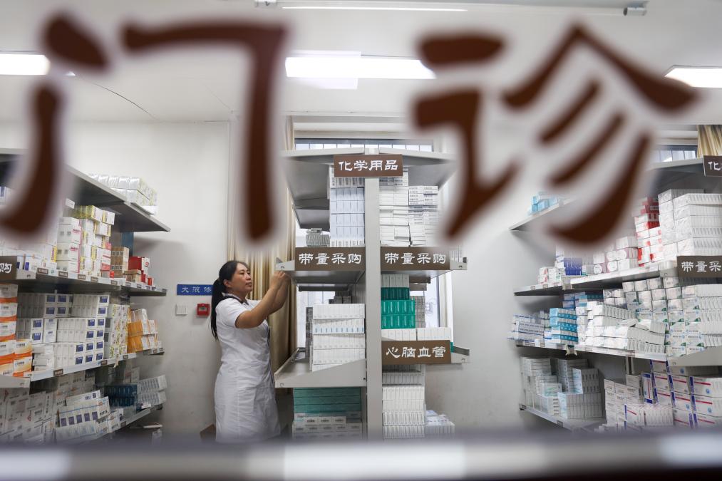 在河北省石家莊晉州市中醫(yī)院,醫(yī)務(wù)人員在門診藥房為患者取藥。新華社發(fā)(賈再興 攝)