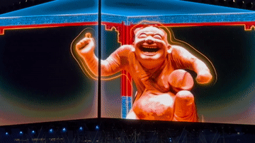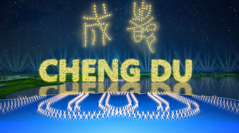 8月7日,吉祥物“蜀寶”和“錦仔”在開幕式上。新華社記者 江宏景 攝