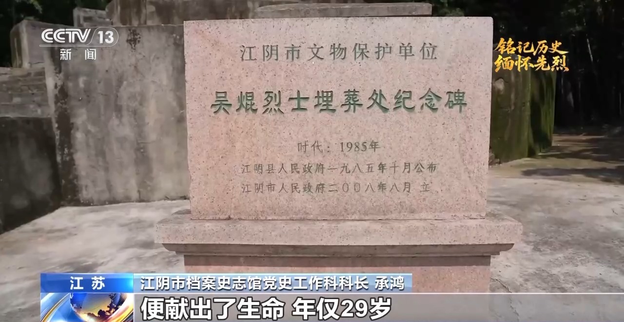 江陰市檔案史志館黨史工作科科長 承鴻:他率領(lǐng)部隊(duì)進(jìn)軍的時候,遭到了國民黨軍隊(duì)的冷槍,吳焜頭部中彈,未及留下只言片語,便獻(xiàn)出了生命,年僅29歲。吳焜參加過長征,歷經(jīng)艱難險阻,在作戰(zhàn)和訓(xùn)練當(dāng)中,處處以身作則,率先垂范。他指揮作戰(zhàn)時經(jīng)常沖在第一線,非常勇猛,正是依靠這種精神和作風(fēng),讓新四軍成為鐵軍。