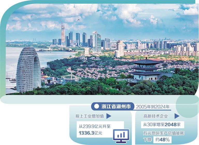 數(shù)據(jù)顯示,2005年到2024年,湖州規(guī)上工業(yè)增加值從239.9億元升至1336.3億元,高新技術企業(yè)從30家增至2048家,萬元地區(qū)生產(chǎn)總值能耗下降約48%。
