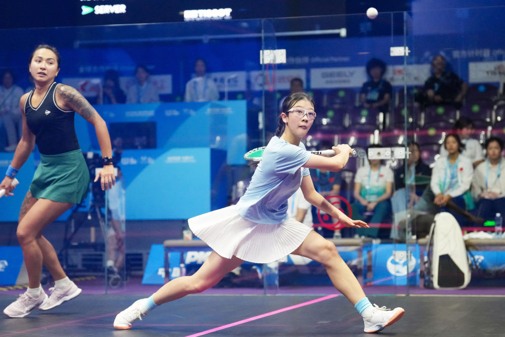 8月9日,中國選手殷子媛(右)在壁球女子單打16強(qiáng)遺材賽中擊球。新華社記者 李旭倫 攝