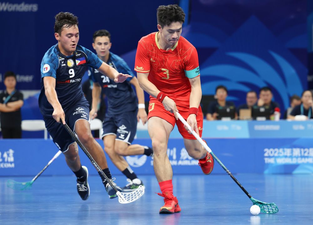 8月12日,中國隊球員杜三洋(右一)在軟式曲棍球男子第七名爭奪賽中帶球進(jìn)攻。新華社記者 梁旭 攝