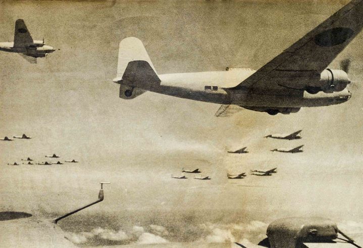 這是侵華日軍大編隊轟炸機群飛向重慶,準備進行轟炸(資料照片,翻拍)。新華社發(fā)