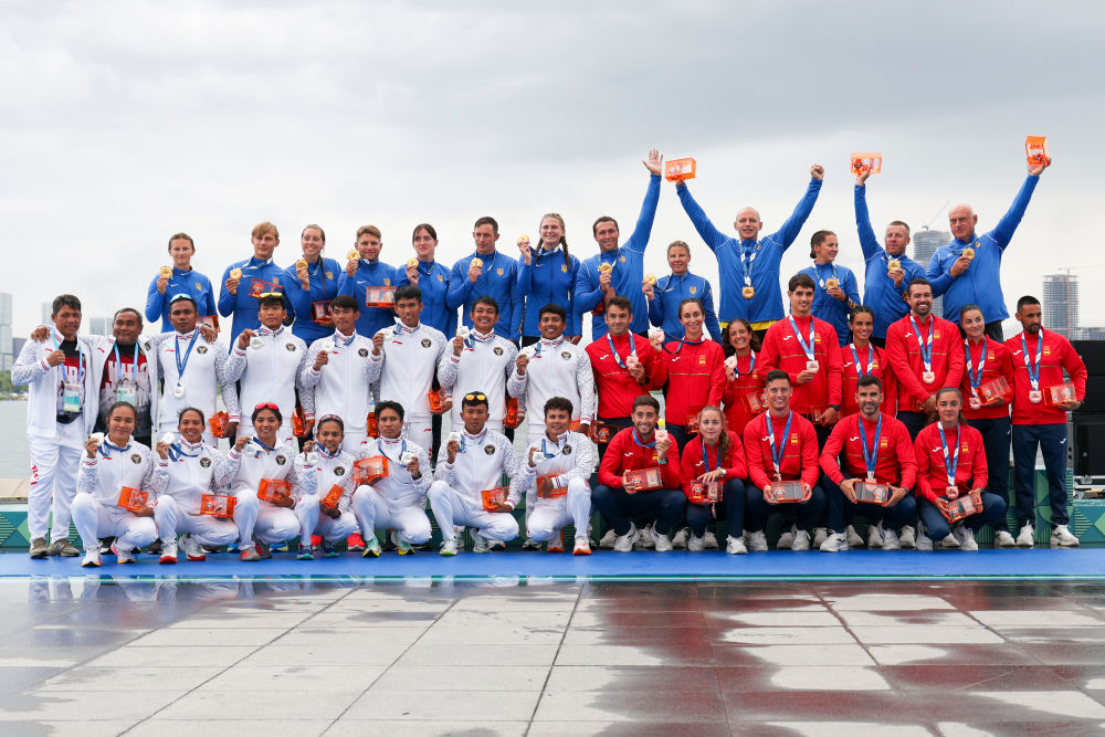 8月10日,冠軍烏克蘭隊(duì)(后)、亞軍印度尼西亞隊(duì)(前左)、季軍西班牙隊(duì)(前右)在龍舟10人座2000米追逐賽頒獎(jiǎng)儀式上。新華社記者 王翔 攝