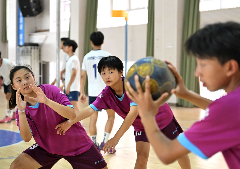 鄭州市第七十六中學(xué)荷球隊(duì)球員練習(xí)傳接球。新華社記者 李嘉南 攝