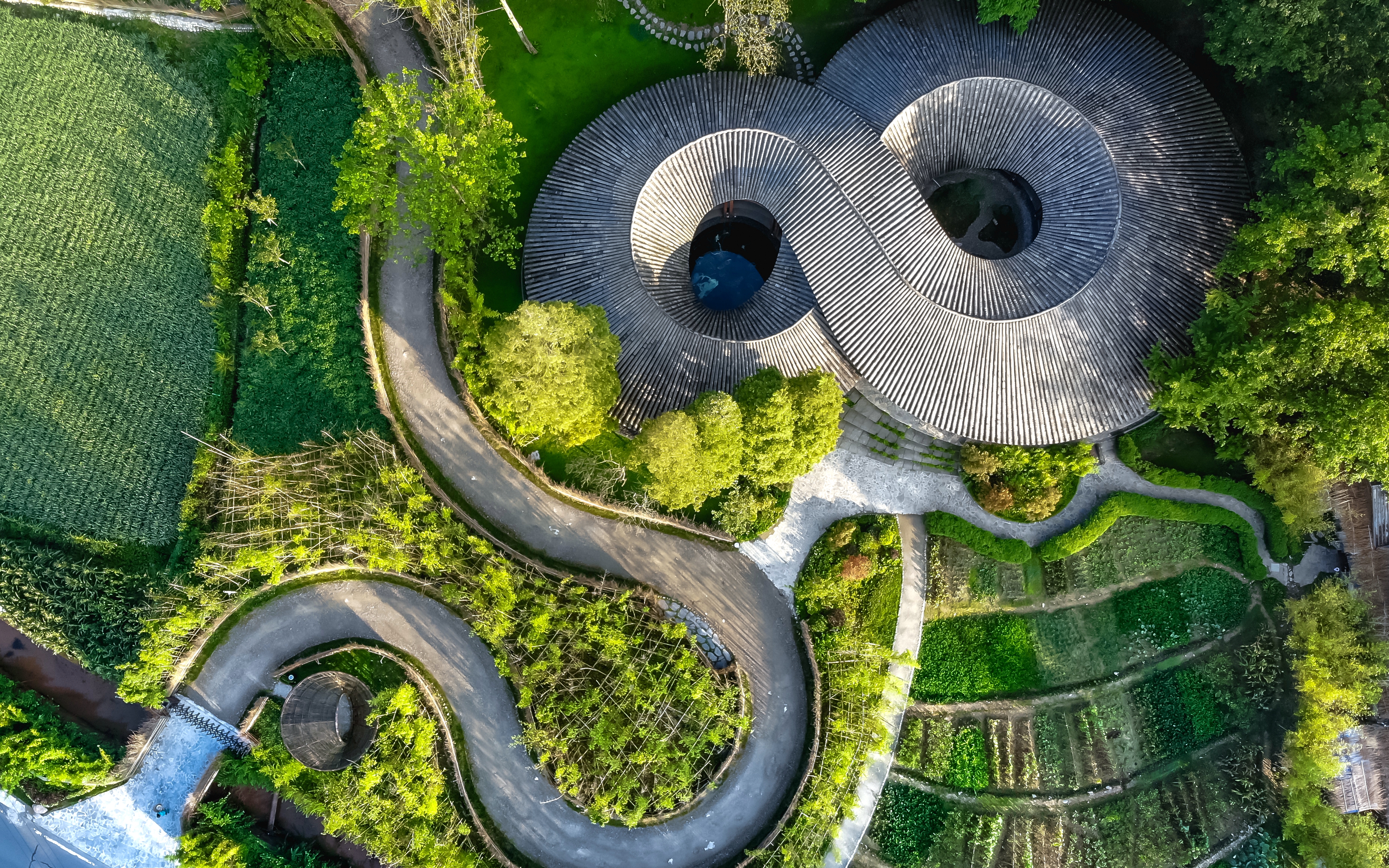 日暮時分,竹藝村的地標性建筑“竹里”被覆上一層金輝。從空中俯瞰這個坐落在竹藝村的“網紅”建筑,形狀如同數學符號中代表無窮的“∞”。竹文化無窮,竹編路無限,讓人不禁期待竹藝村更加精彩的未來……