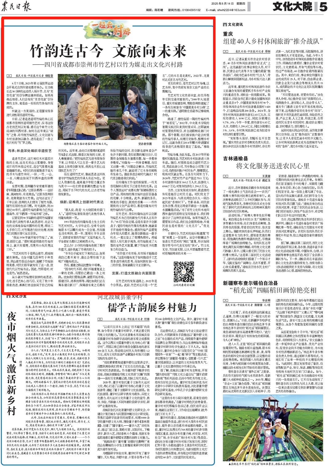 當然,文旅發(fā)展成效如何,最直接的體現(xiàn)是能否讓村民受益。村民倪龍2023年返鄉(xiāng),與妻子共同辦起民宿“竹里香居”。竹編屏風、竹制燈罩,將民宿裝點得古樸雅致。“為了將竹文化和本地川西林盤的民俗生活緊密結合,我們特意設計了這種民宿風格。如果竹編藝人需要展示作品,我們也會提供場地,畢竟民宿也是村里的‘文化名片’?!蹦啐堈f。