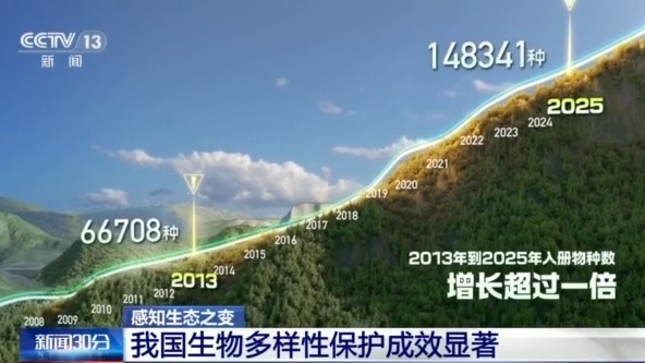 如今,《中國生物物種名錄》上“入冊”的生物種數(shù),從2013年的6.7萬種,增長到2025年的14.8萬種,增長超過1倍。近500種野生動植物的受威脅等級出現(xiàn)下降。