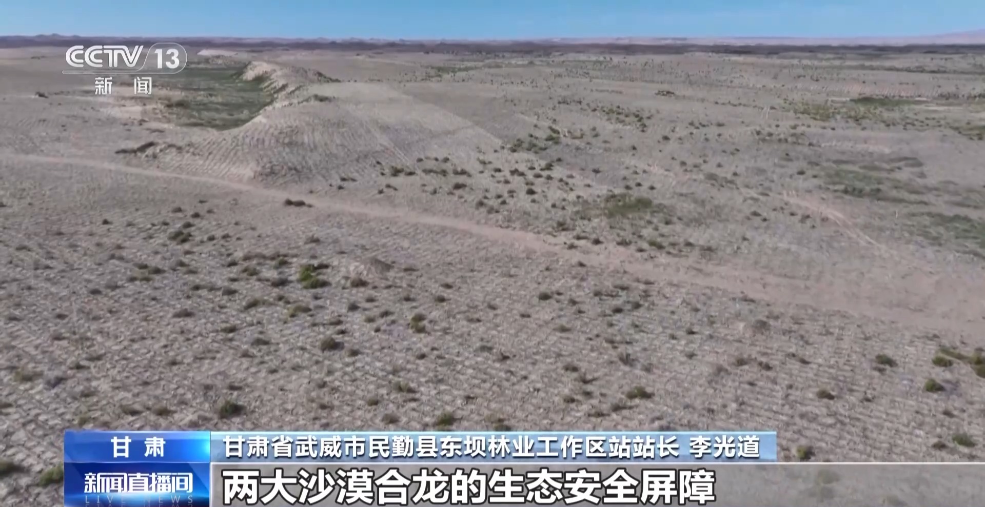 甘肅省武威市民勤縣林業(yè)技術推廣站站長 陶海璇:在推進環(huán)綠洲鎖邊林帶閉環(huán)圍合過程中,我們綜合應用了多種科學方法和生態(tài)工程技術。先固沙后造林,喬灌草結合;引進履帶式治沙機、手扶式壓沙機、打坑機、無人機等治沙設備,開展人工加無人機模式,機械作業(yè)率逐步提高,大幅提升了治理效能。