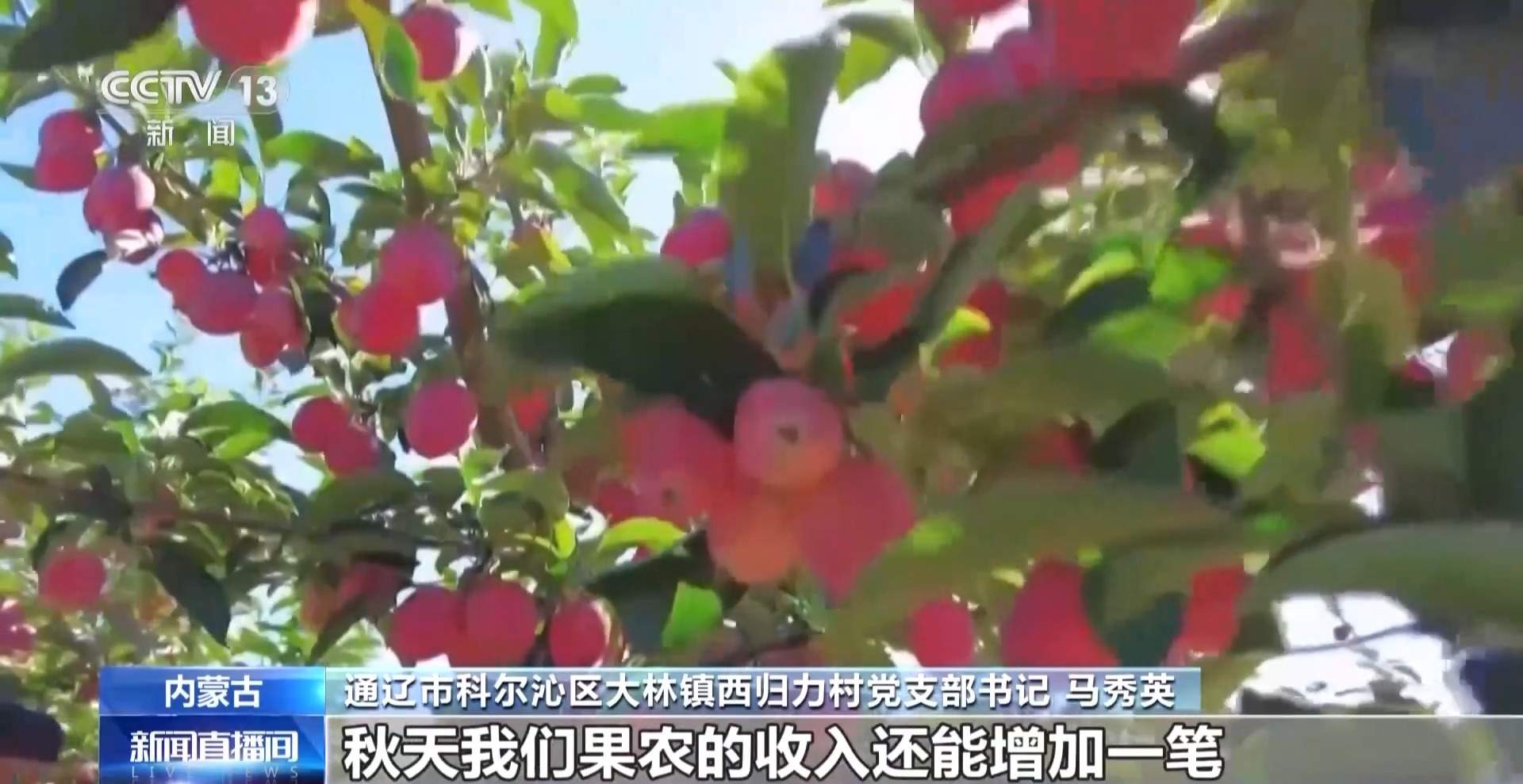 通遼市科爾沁區(qū)大林鎮(zhèn)西歸力村黨支部書記 馬秀英:今年的果長得特別好,我們引進了深加工,秋天我們果農(nóng)的收入還能增加一筆。