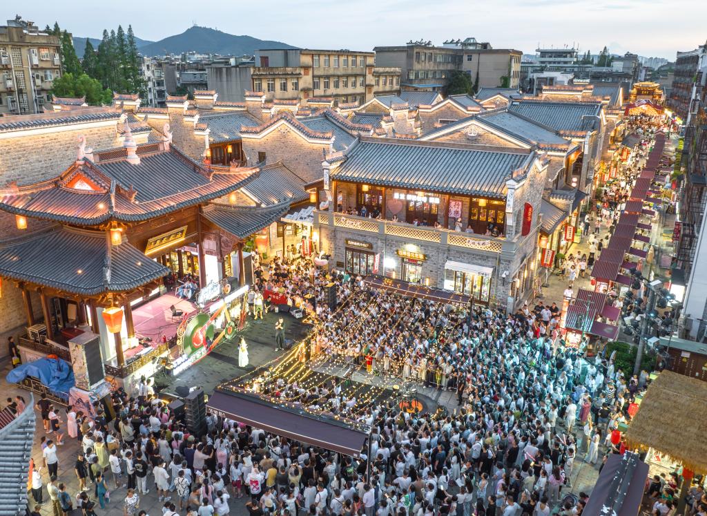 7月25日,游客在湖北省襄陽古城管家巷文化休閑街區(qū)觀看星光音樂會(huì)(無人機(jī)照片)。新華社發(fā)(楊東攝)