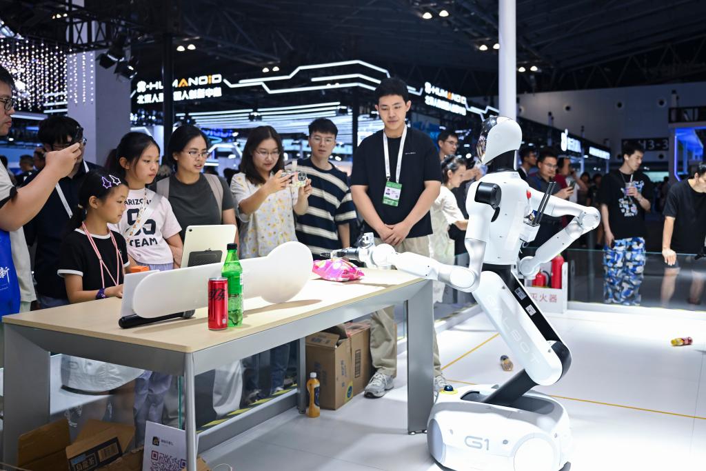 7月29日,上海2025世界人工智能大會(huì),參觀者在觀賞一款可用于零售、工業(yè)等多種場景的機(jī)器人。新華社記者 陳浩明 攝