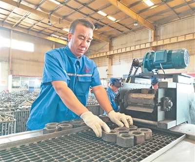 【鏡頭】在甘肅定西安定區(qū)的定西高強(qiáng)度緊固件股份有限公司車間里,負(fù)責(zé)質(zhì)量檢測的邢亞軍仔細(xì)檢查拳頭大小的六角螺母。