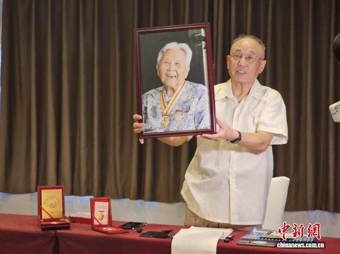 臺(tái)胞蘇菁之子張正光舉起2015年母親佩戴中國人民抗日戰(zhàn)爭(zhēng)勝利60周年、70周年紀(jì)念章拍下的照片。黃欣欣 攝