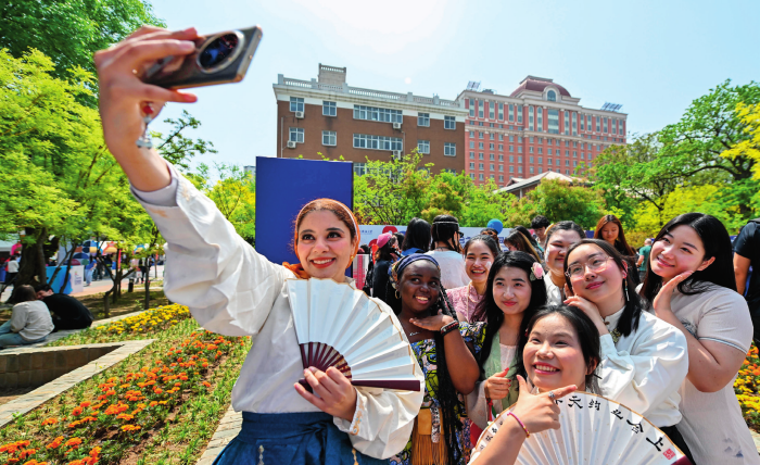 中外青年在以“上合之約天外同彩”為主題的天津外國(guó)語大學(xué)第八屆國(guó)際文化節(jié)上合影留念(2025 年 4 月 20 日攝)孫凡越攝 / 本刊