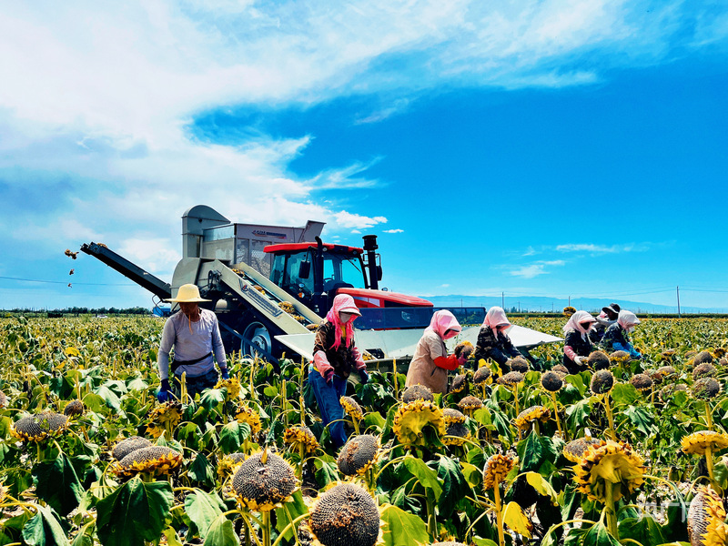 藍天白云下,農民們與農機協(xié)同,在向日葵田忙碌收獲(央廣網(wǎng)發(fā) 馬曉甜 攝)
