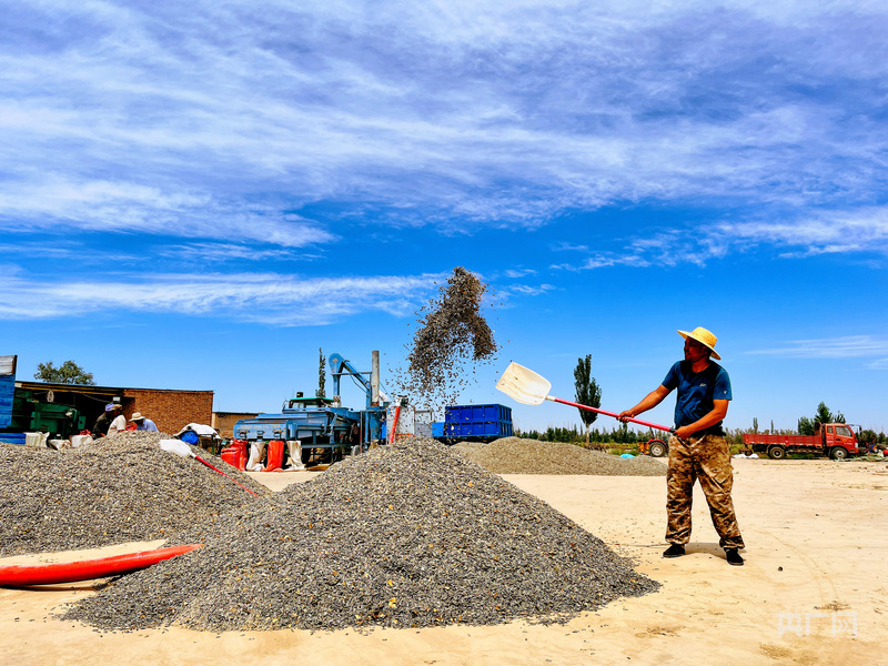 農民在藍天下奮力鏟揚作物,豐收的喜悅在堆場彌漫(央廣網(wǎng)發(fā) 徐曉瑤 攝)