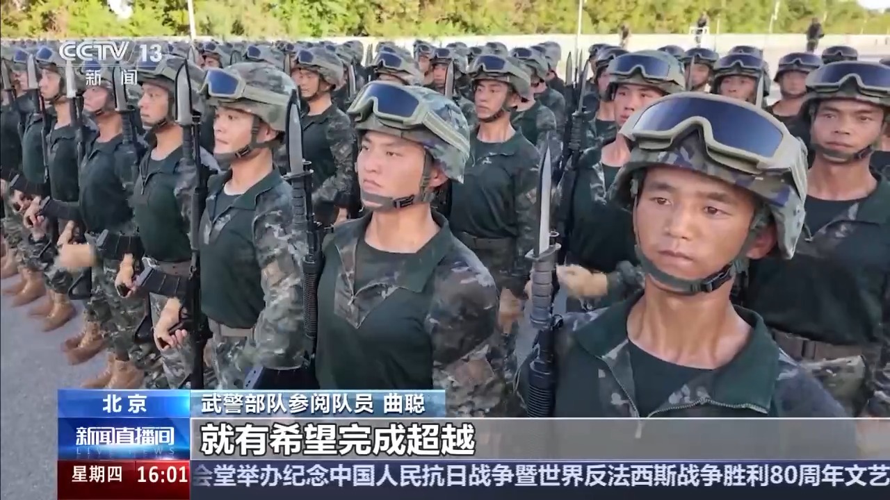 武警部隊方隊方隊長 崔曉偉:目前我們已經(jīng)進(jìn)入最后的沖刺階段,在紀(jì)念抗戰(zhàn)勝利80周年紀(jì)念日當(dāng)天,以最昂揚的精神狀態(tài)、最標(biāo)準(zhǔn)規(guī)范的受閱動作,光榮地接受黨和人民檢閱,接受習(xí)主席檢閱。