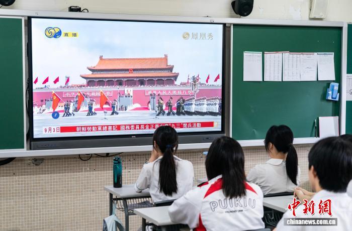 9月3日,香港培僑中學學生觀看紀念中國人民抗日戰(zhàn)爭暨世界反法西斯戰(zhàn)爭勝利80周年大會直播。中新社記者 侯宇 攝