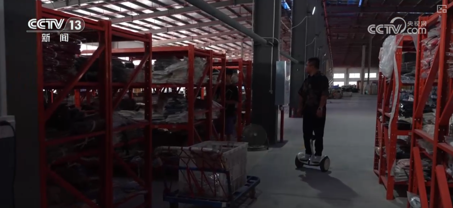 當記者在天門服裝產(chǎn)業(yè)園里碰到費文的時候,他正騎著電動平衡車在庫房的貨架之間來回穿梭。