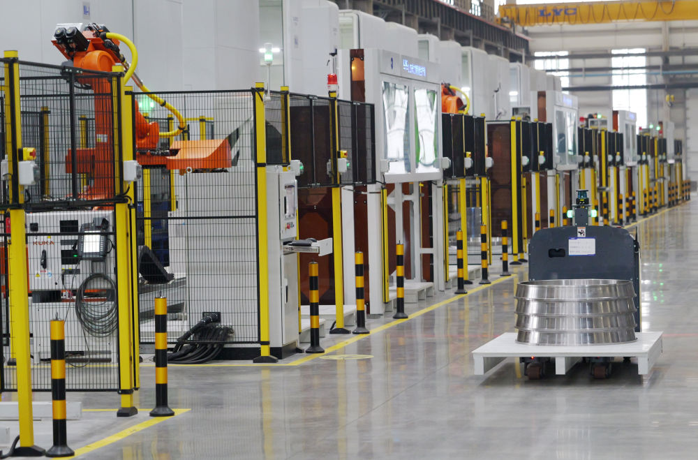 5月22日,自動導引車在洛軸集團智能工廠生產(chǎn)線上作業(yè)。新華社記者 李嘉南 攝