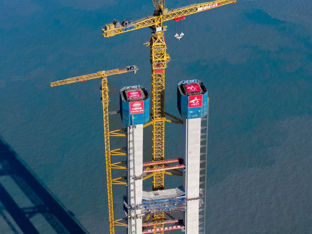 圖為雙嶼門特大橋首個(gè)主塔封頂施工現(xiàn)場(chǎng)。(中國(guó)鐵建大橋局供圖)