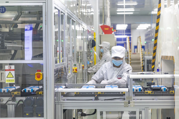 2024年9月27日,在位于重慶市銅梁區(qū)的海辰儲能重慶制造基地,工作人員在生產線上初步檢測兩個電芯是否配對。