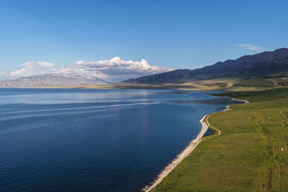 ↑ 賽里木湖景致(無人機照片,7月8日攝)。