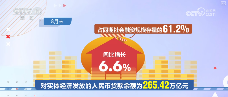 初步統(tǒng)計,8月末,社會融資規(guī)模存量為433.66萬億元,同比增長8.8%。其中,對實體經(jīng)濟發(fā)放的人民幣貸款余額為265.42萬億元,同比增長6.6%,占同期社會融資規(guī)模存量的61.2%。