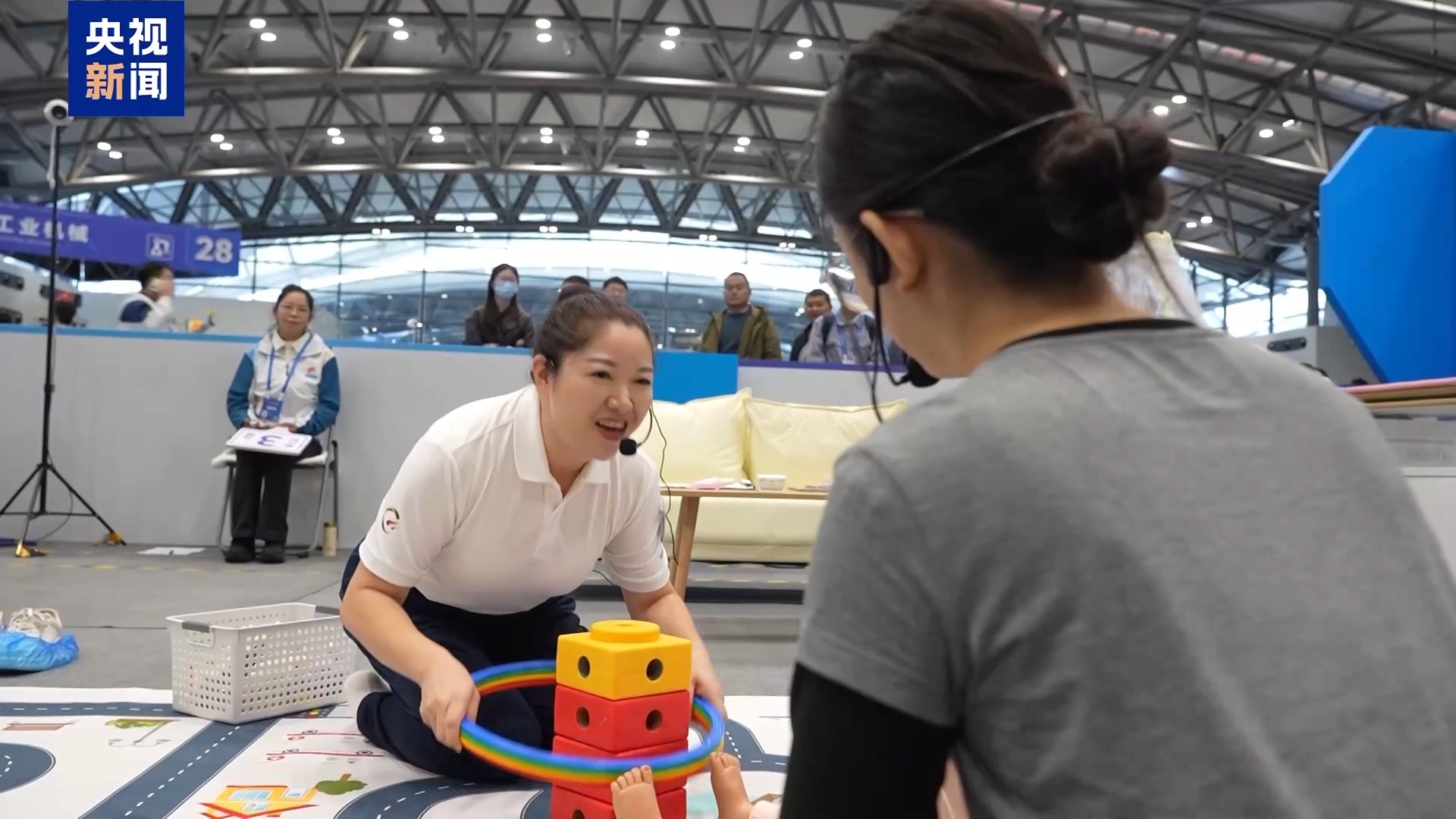 賽場上,一個個格子間按照真實(shí)居家場景布置,選手們按照流程,完成從上門拜訪、嬰兒互動、游戲設(shè)計、家長交流等系列服務(wù)工作。記者注意到,這次比賽創(chuàng)新引入會哭鬧的智能化模擬嬰兒,選手抱姿不對、饑餓都會有數(shù)據(jù)反饋,考驗(yàn)選手的回應(yīng)性照顧能力,同時邀請了一些嬰幼兒家長進(jìn)行配合互動。